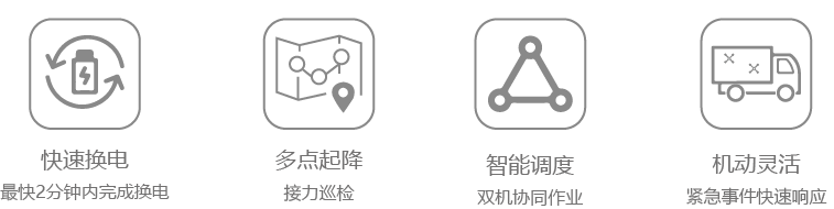 车载式无人机双机换电机场,赋予换电机场移动作业能力,有效扩大无人机作业范围。换电机场可部署2台DJl Mavic3系列行业无人机,内置多组飞行电池循环换电,实现无人机快速轮转作业。系统支持多台无人机协同作业、多点起降。车载机场兼具机动灵活性,可适应野外复杂地形、路况,突发情况可快速响应。支持无人值守完成高强度连续作业,覆盖多行业、多场景的应用需求。